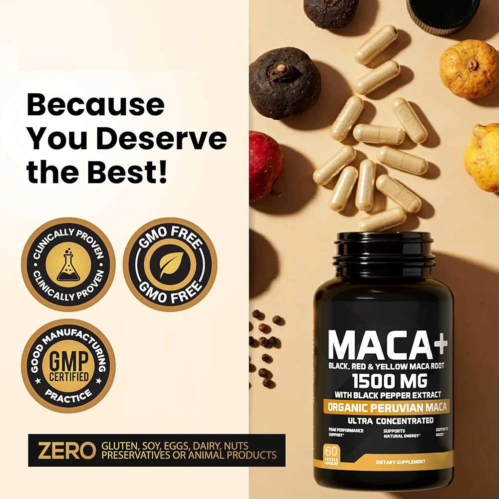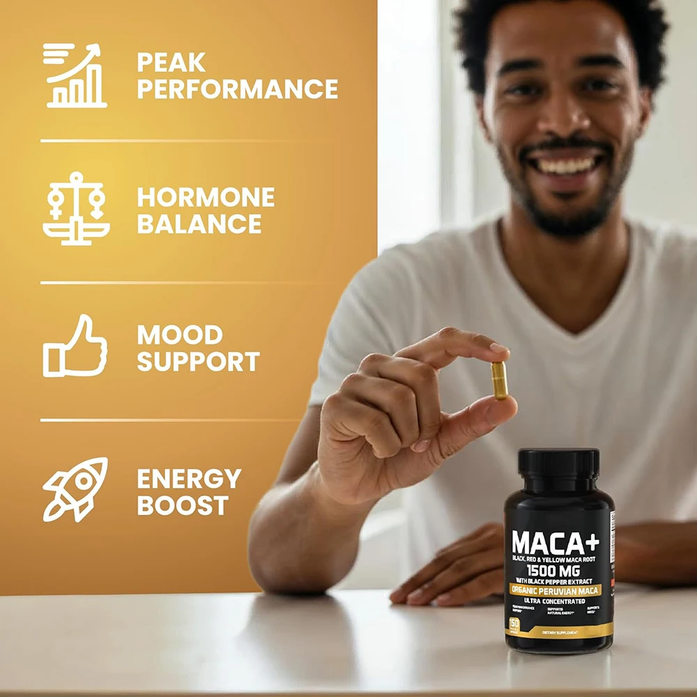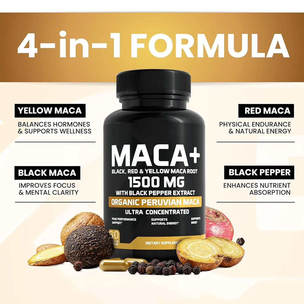 Key Ingredients: Organic Peruvian Maca Root Extract (Black, Red & Yellow), Black Pepper Extract